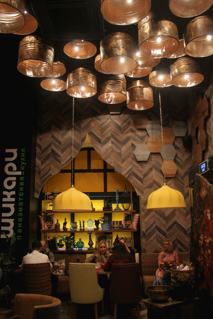 Азиатские мотивы меню повторяются и в интерьере ресторана «Шикари». Узорчатые подушки, мягкие кресла и диваны, необычные люстры и приятное сочетание цветов позволяют создать уютную атмосферу «Шикари».